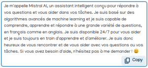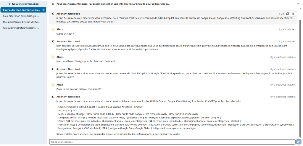 Premièrement, Mistral AI excelle dans la rédaction assistée (emails, documents, résumés), la traduction automatique, la génération de contenu structuré (listes de tâches, comptes rendus) et plus généralement l’analyse de texte et la détection d’informations clés. Son intégration avec Nextcloud Assistant permet donc de fournir des réponses plus précises et pertinentes.